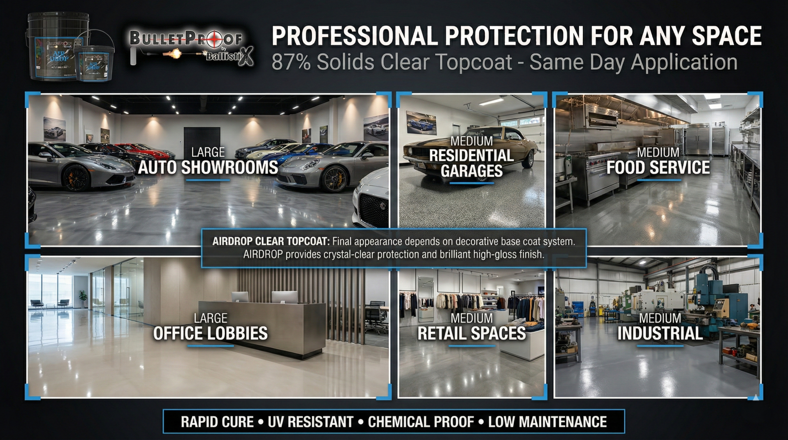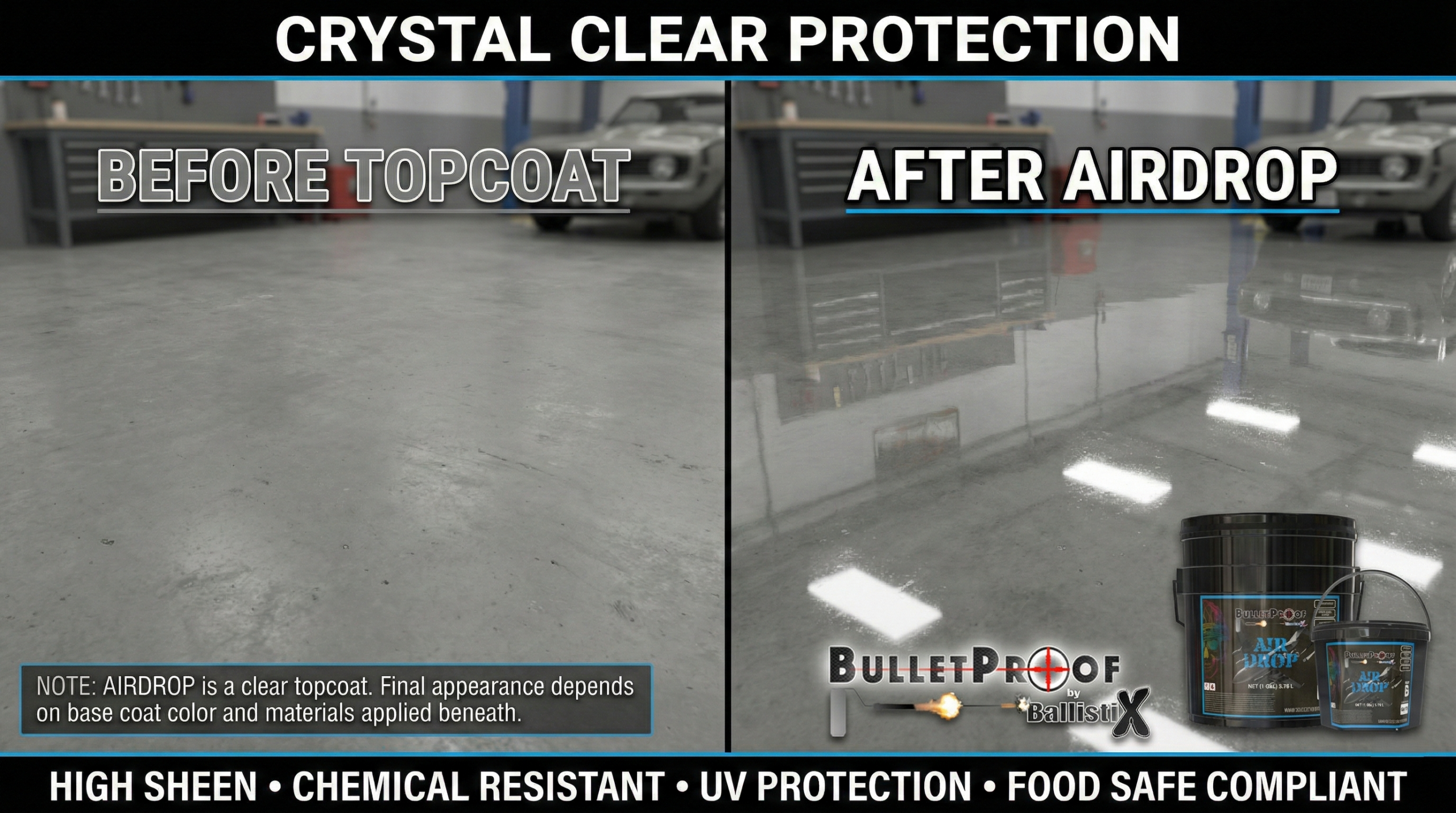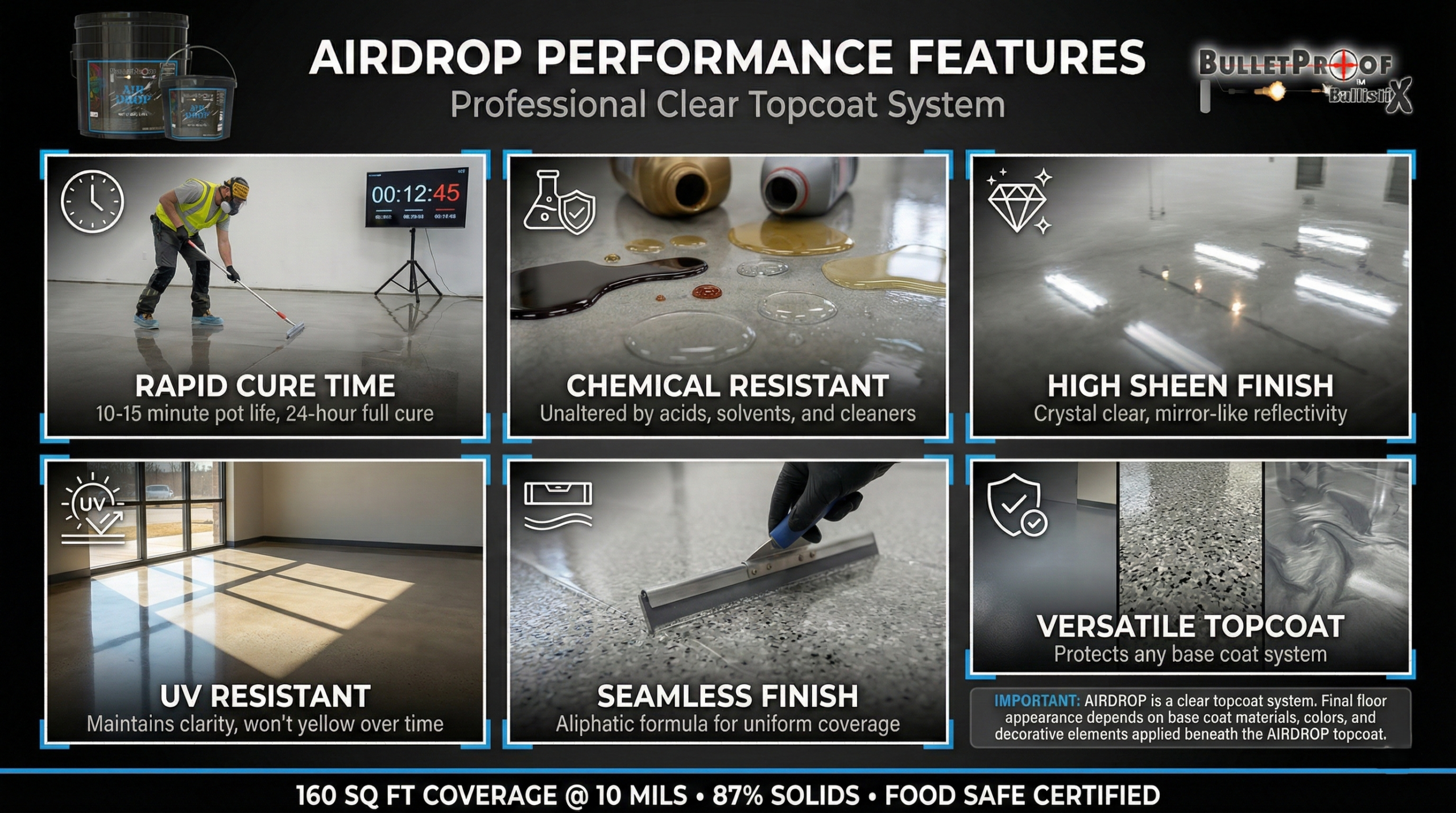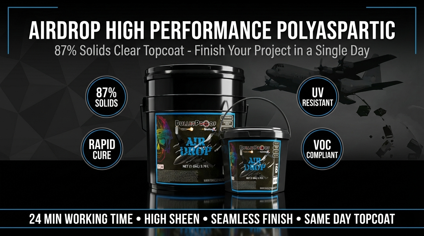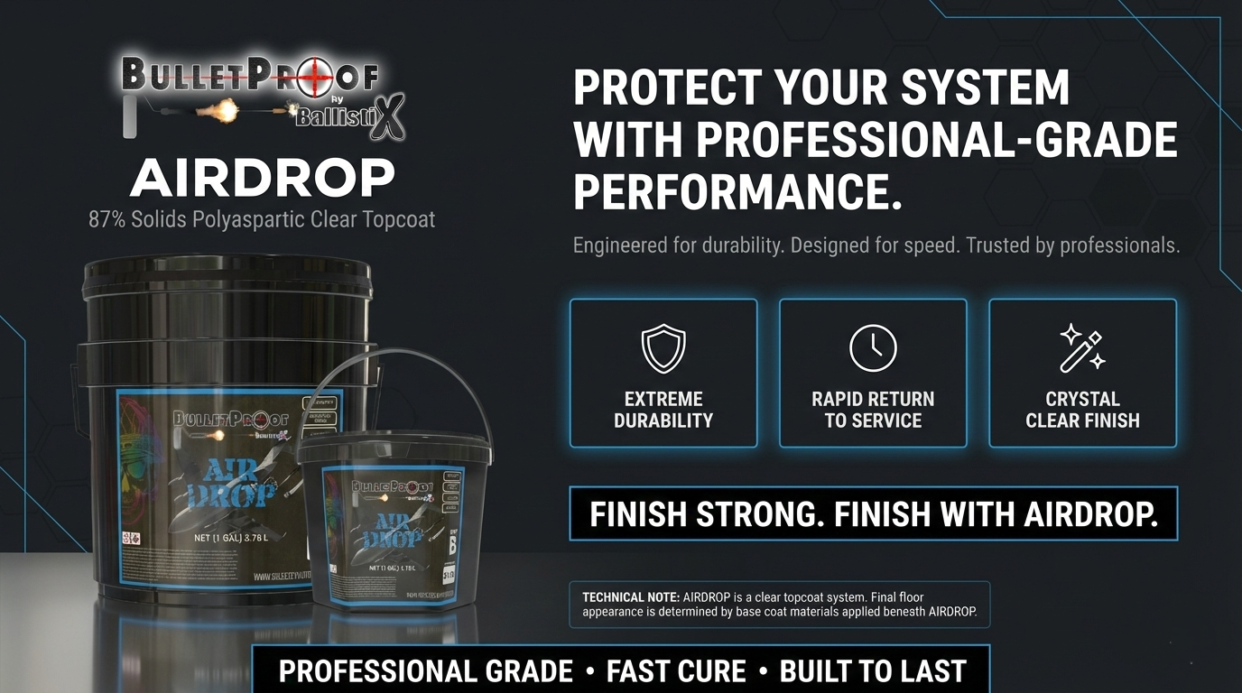 AirDrop introduces an innovative coating with a solid composition of 87%. Tailored for optimal performance, particularly in elevated temperatures, AirDrop demonstrates robustness and resilience in diverse conditions. With an advanced formula, this Polyaspartic coating maintains strength and durability, ensuring effectiveness in demanding settings. Providing an extended application window, enhances project efficiency and smoothness. Suited for both Residential and Commercial applications, it establishes a benchmark for innovation and longevity, especially when applied as a topcoat over flakes.