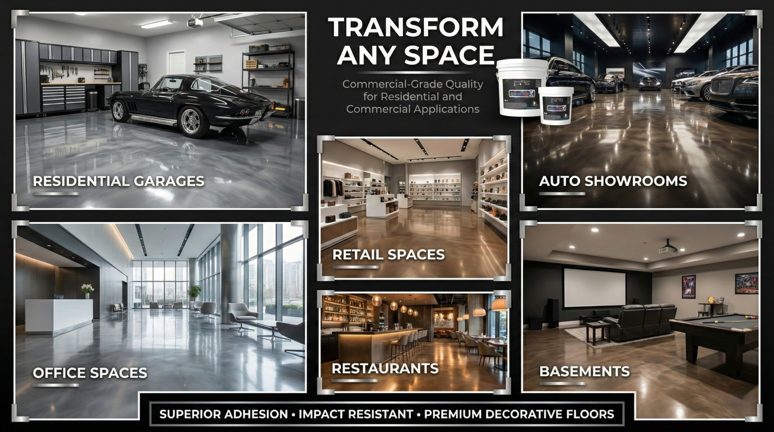 Garages, showrooms, retail spaces, restaurants, offices, basements, and any space where a premium decorative floor is desired.